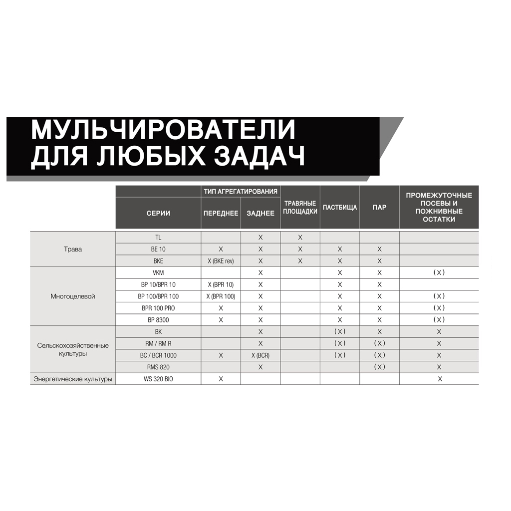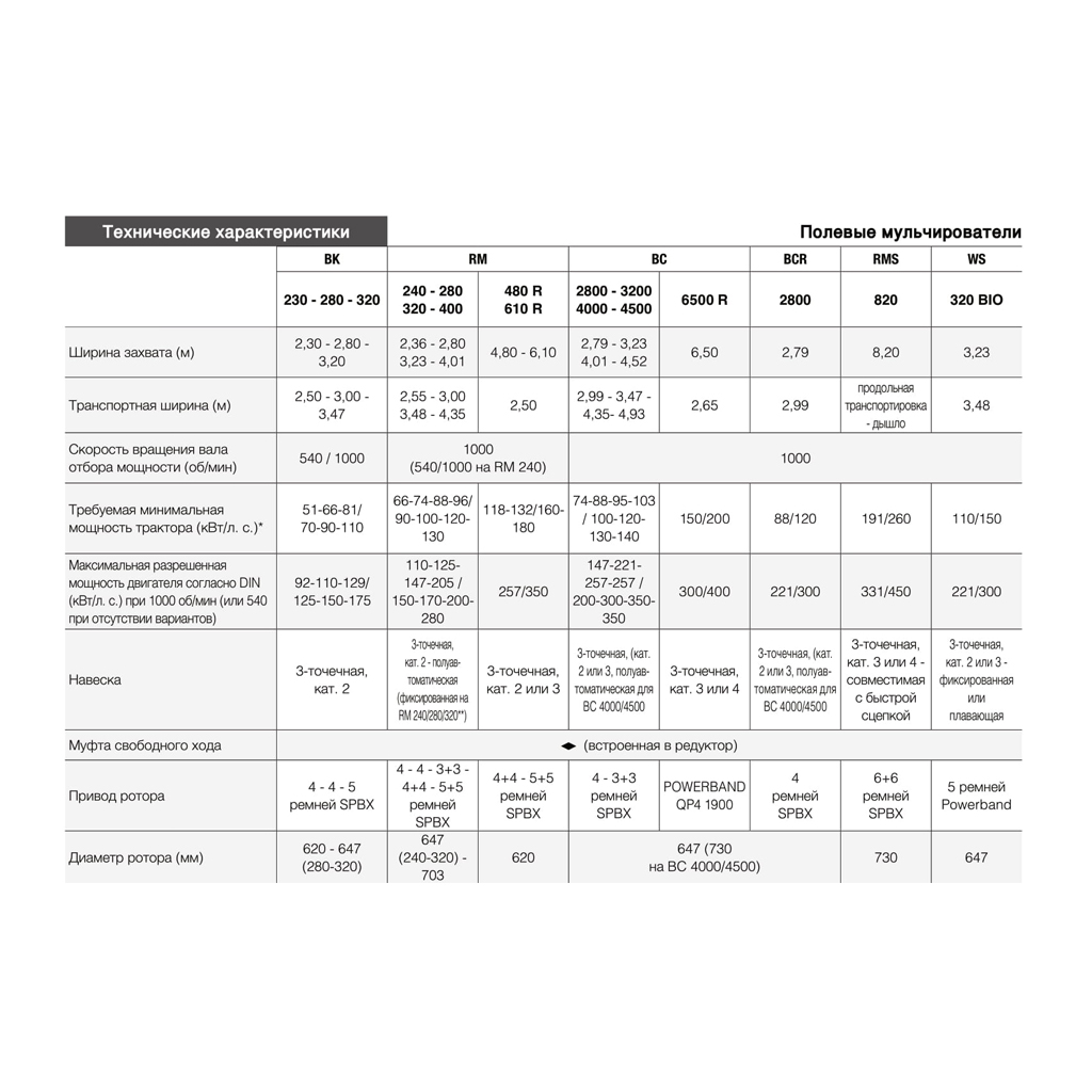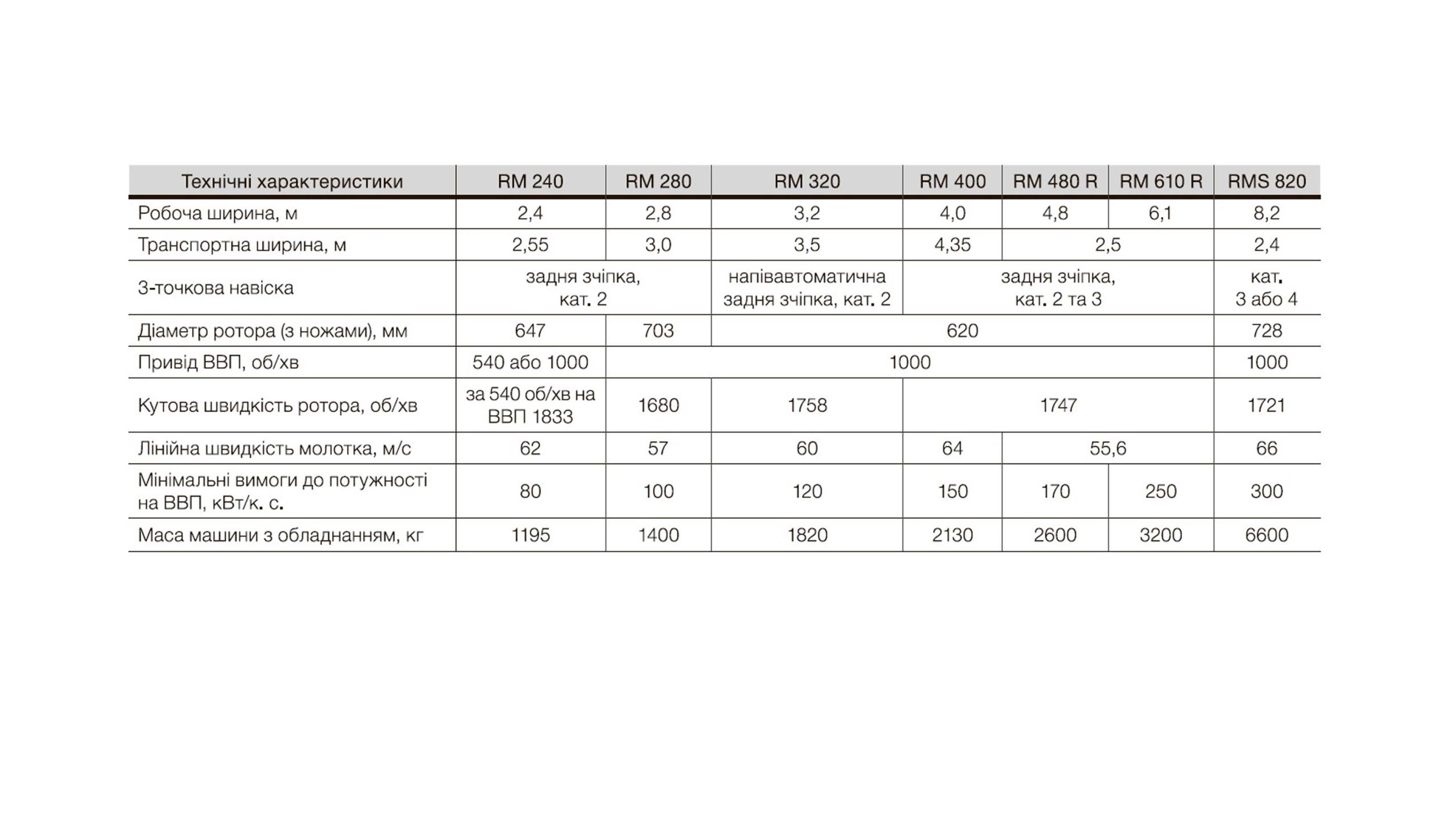 – RM 240, RM 280, RM 320, RM 400, RM 480, RM 610 – ефективно подрібнюють пожнивні залишки, такі як стебла зернових культур, соняшнику чи кукурудзи, і підходять для догляду за пасовищами та луками. Однак, основною сферою їх застосування є зернові господарства