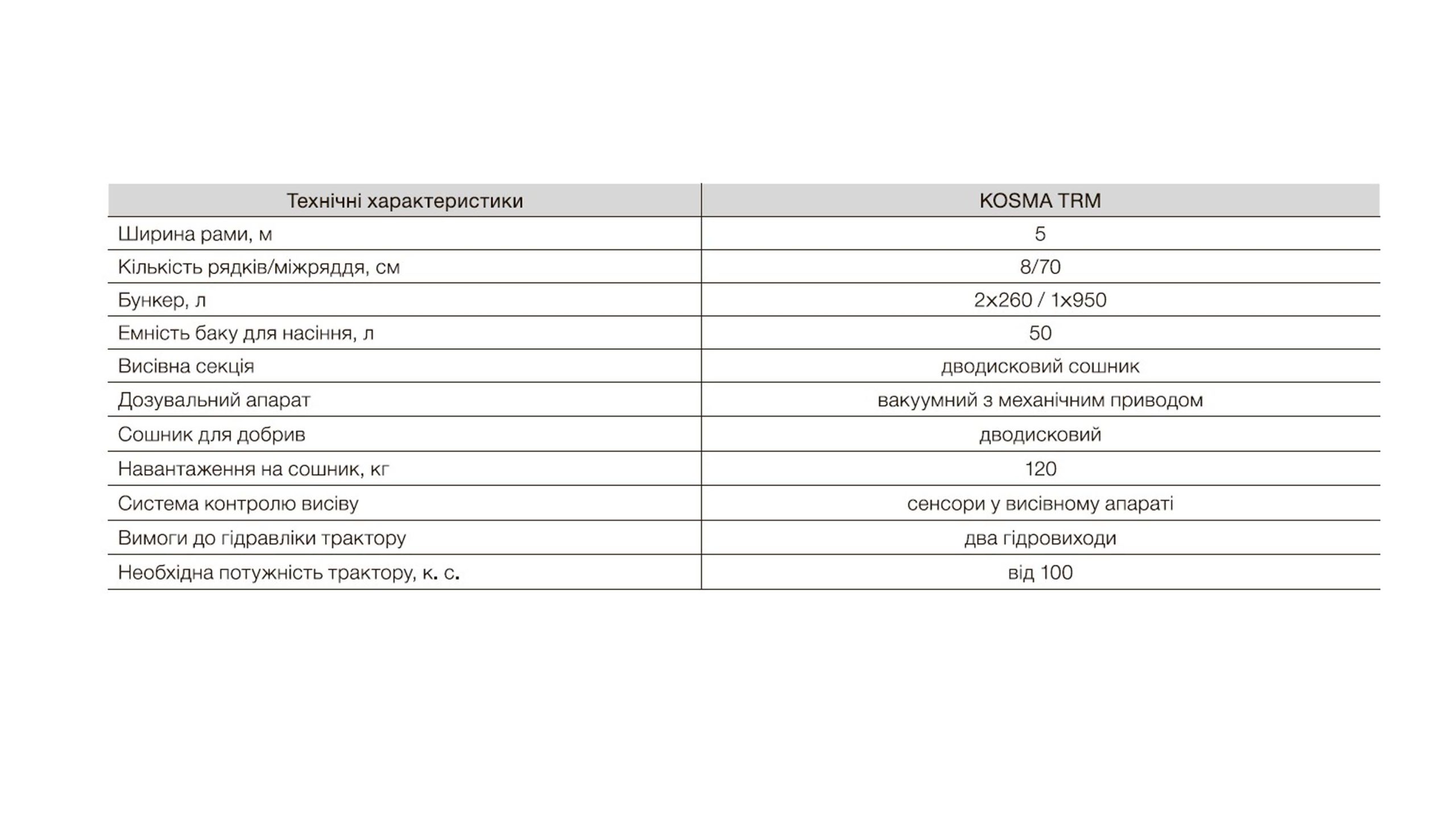 Пневматична сівалка Kosma розроблена для роботи з основними технічними культурами за мінімальною та класичною технологією висіву. Є компромісним варіантом між лінійками Maxima та Planter. Агрегатується з легкими тракторами потужністю від 80 /к.с, відрізняється простим налаштуванням параметрів. Здійснює висів на швидкості від 4 до 8 км/год. Доступна фермерам у чотирьох варіаціях рам. Скорочує споживання палива, запобігає ущільненню обробленого ґрунту. Оснащена високоточною системою висіву MAXIMA 3. Об’єм бака для насіння варіюється.