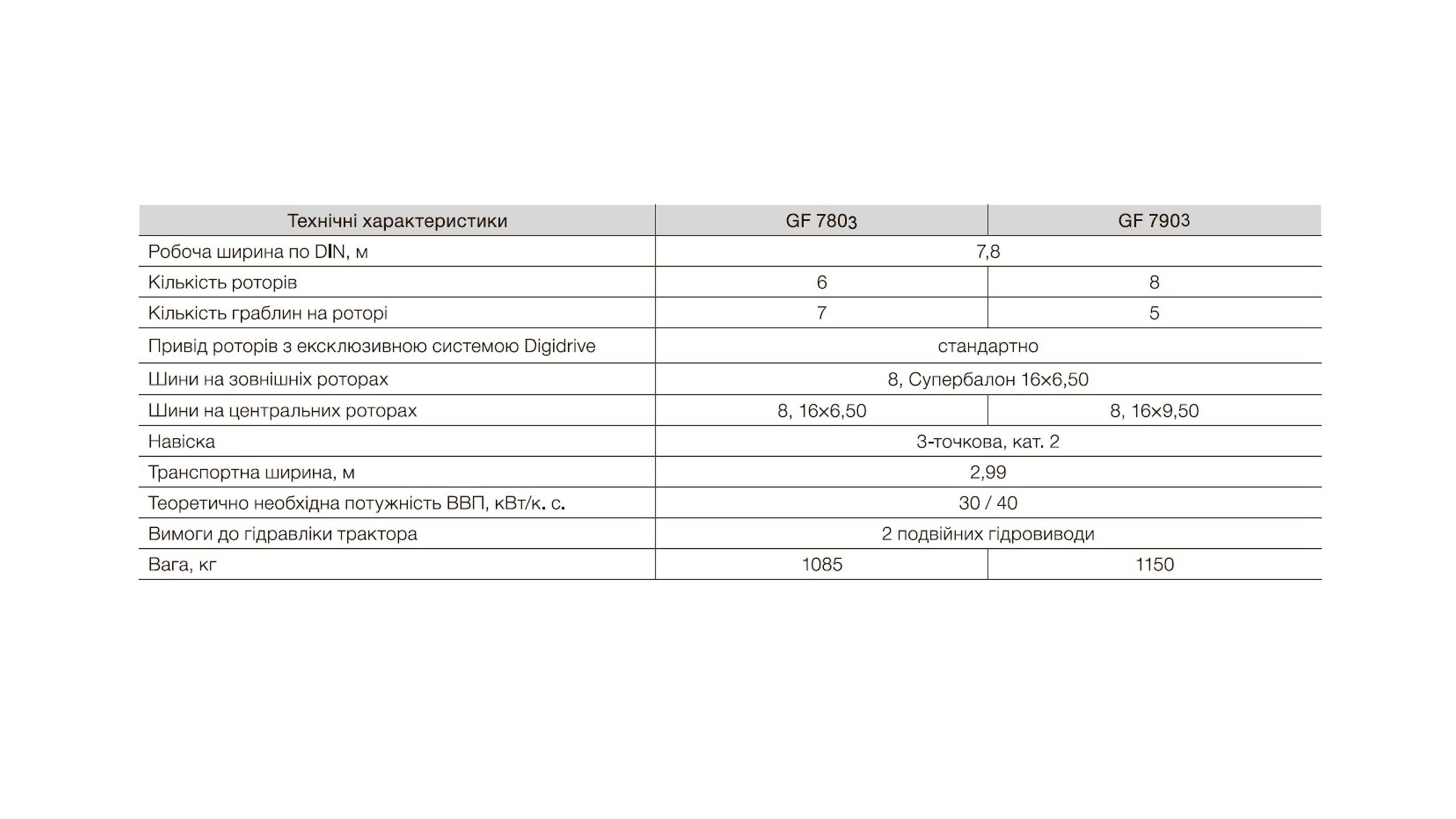 Ворушилки КУН GF мають від 4 до 8 роторів та робочою шириною від 5,20 м до 7,80 м.